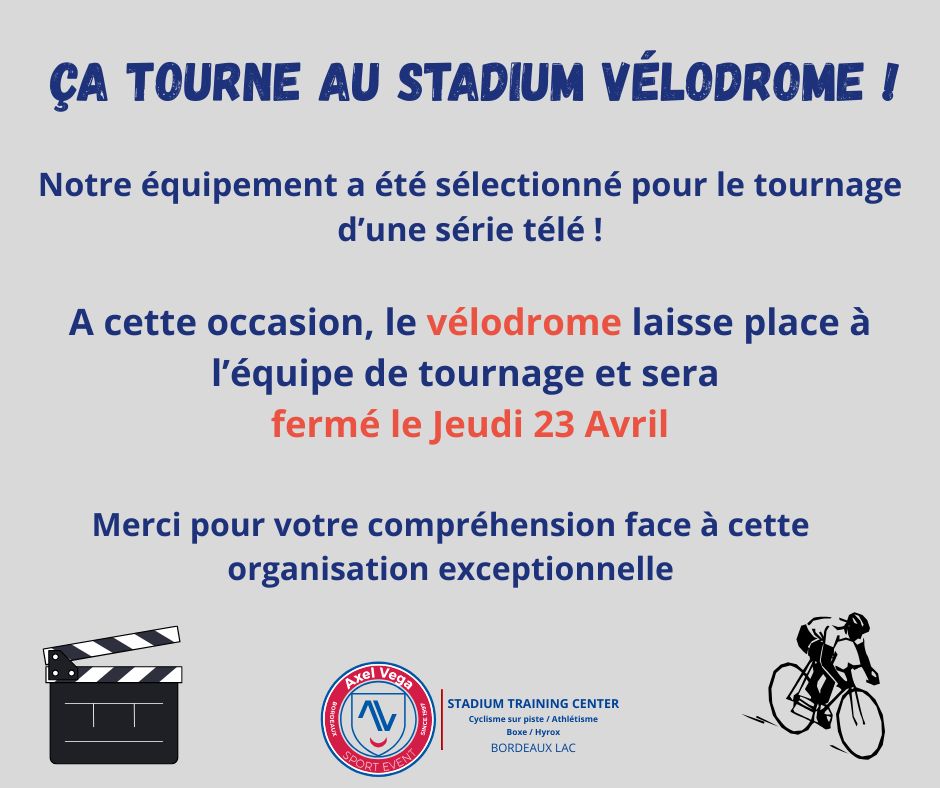 Accueil > Actualités > ça tourne au Stadium Vélodrome ! Fermeture exceptionnelle le 23 Avril