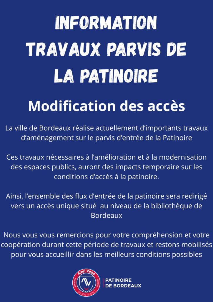 27 février 2026 Patinoire de Bordeaux Accueil > Actualités > Information importante : Accès Patinoire pendant la durée les travaux Information importante : Accès Patinoire pendant la durée les travaux
