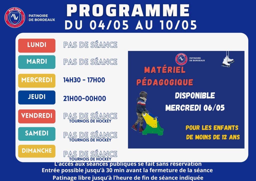 29 avril 2026 Patinoire de Bordeaux Accueil > Actualités > Planning séance de patinage du 04 au 10 Mai 2026 Planning séance de patinage du 04 au 10 Mai 2026
