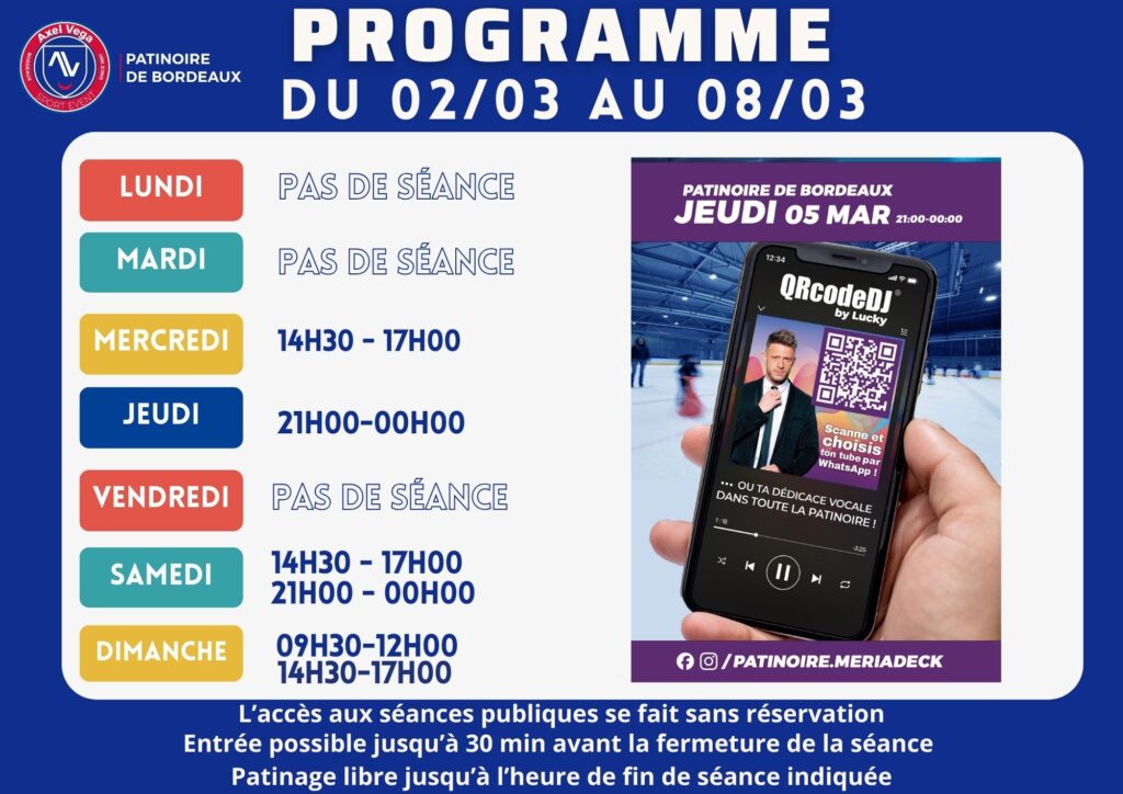 27 février 2026 Patinoire de Bordeaux Accueil > Actualités > Planning Séance de patinage du 2 au 8 Mars 2026 Planning Séance de patinage du 2 au 8 Mars 2026