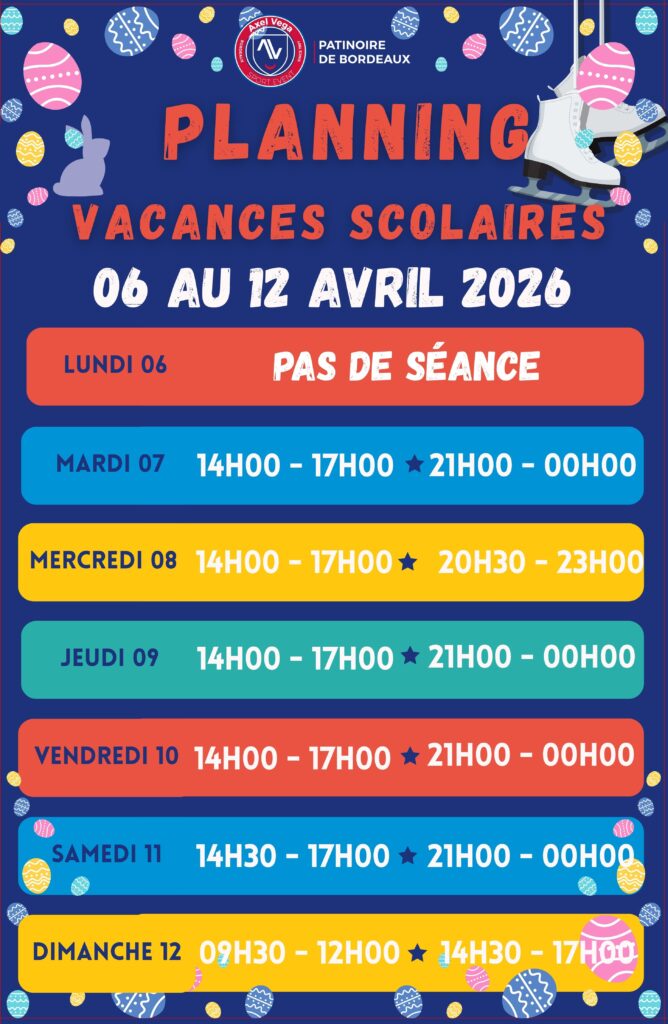 Planning séance de patinage Vacances Scolaires du 6 au 19 Avril 2026 - Axel Vega