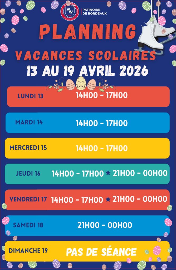 Planning séance de patinage Vacances Scolaires du 6 au 19 Avril 2026
