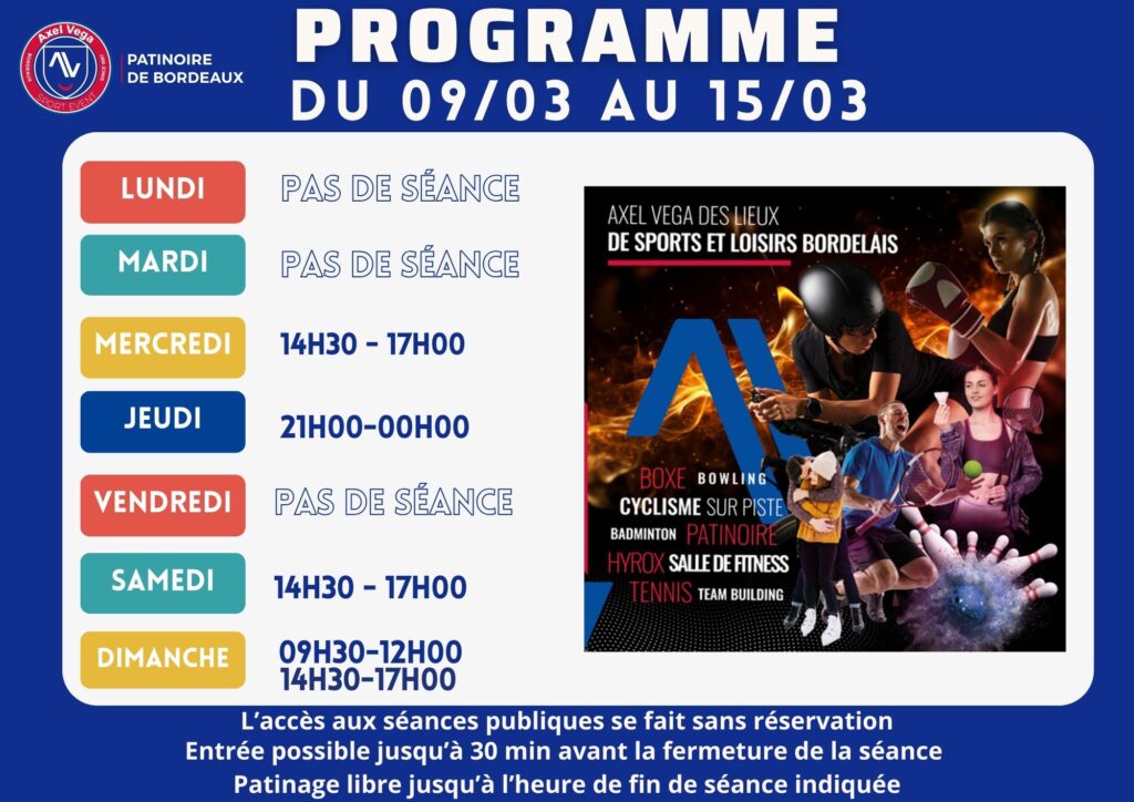 9 mars 2026 Patinoire de Bordeaux Accueil > Actualités > Planning séance patinage du 09 au 15 Mars 2026 Planning séance patinage du 09 au 15 Mars 2026