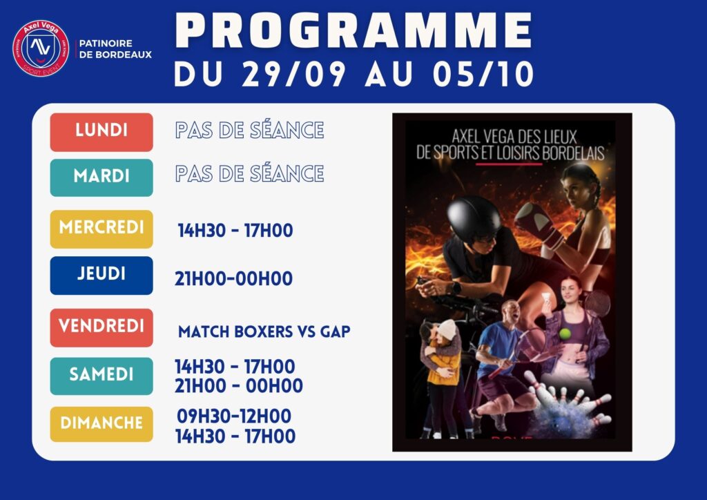 24 septembre 2025 Patinoire de Bordeaux Accueil > Actualités > Planning séance publique patinoire du 29 Septembre au 05 Octobre Planning séance publique patinoire du 29 Septembre au 05 Octobre