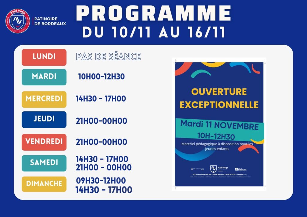 5 novembre 2025 Patinoire de Bordeaux Accueil > Actualités > Planning séance du 10 au 16 Novembre 2025 Planning séance du 10 au 16 Novembre 2025