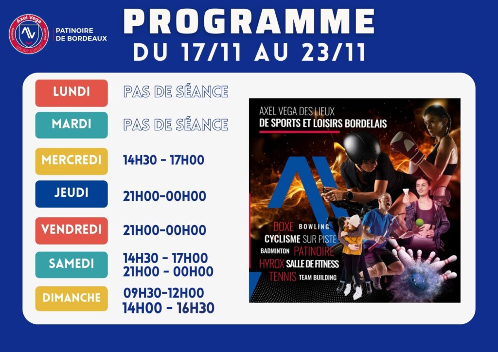 13 novembre 2025 Patinoire de Bordeaux Accueil > Actualités > Planning Séance du 17 au 23 Novembre 2025 Planning Séance du 17 au 23 Novembre 2025