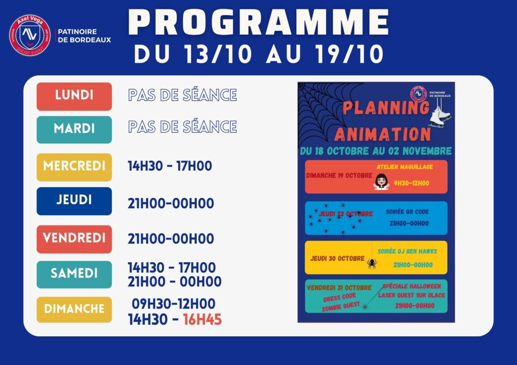 7 octobre 2025 Patinoire de Bordeaux Accueil > Actualités > Planning Séance publique du 13 au 19 Octobre 2025 Planning Séance publique du 13 au 19 Octobre 2025